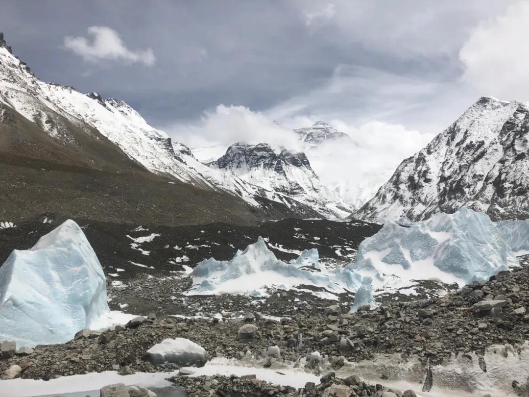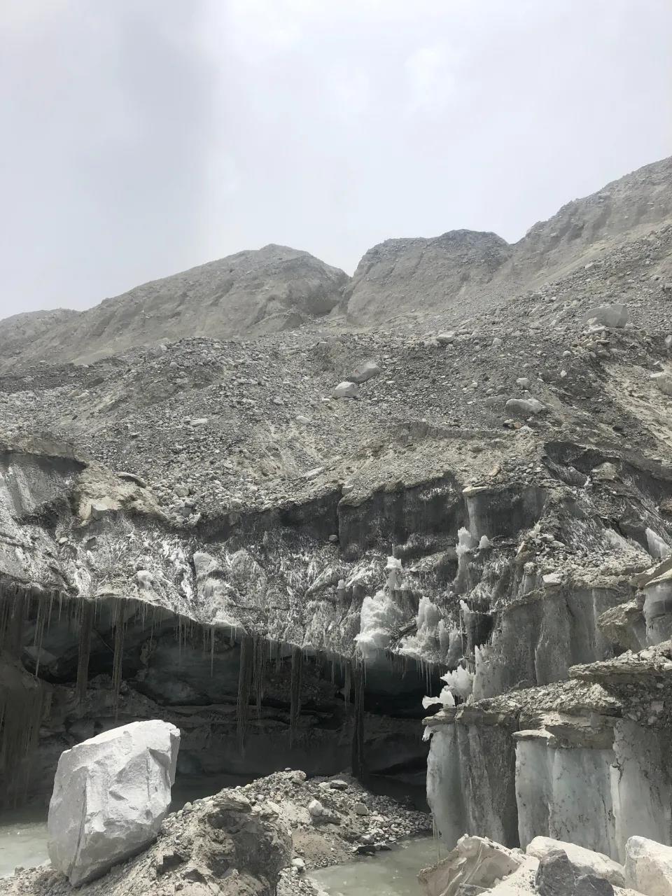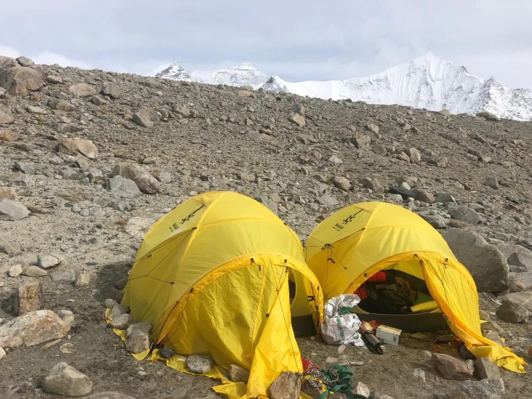 全程没有路,只有乱石乱石乱石,冰川冰川冰川,陡坡陡坡陡坡。有些路段乱石嶙峋,要踩着石头尖走,如练梅花桩功。有些路段碎石遍布,踩一脚滑一脚,好几次我都险些滑倒。不知爬下几个山沟,攀上几个险坡,两个小时后我们来到中绒布冰川。在被泥土和碎石覆盖的冰川上,有个用石头垒成的挡风墙,墙内一片洼地,这是固定的午餐地点。格桑说走了快一半了,我们心里轻松了很多,但后来才知道,距离确实一半了,但前面的艰辛根本不值一提。我们的午饭是干饼加榨菜,格桑和扎西带了自热米饭。吃过饭,我们把垃圾装进袋子里,压在石头下面,明天下撤时带回大本营。