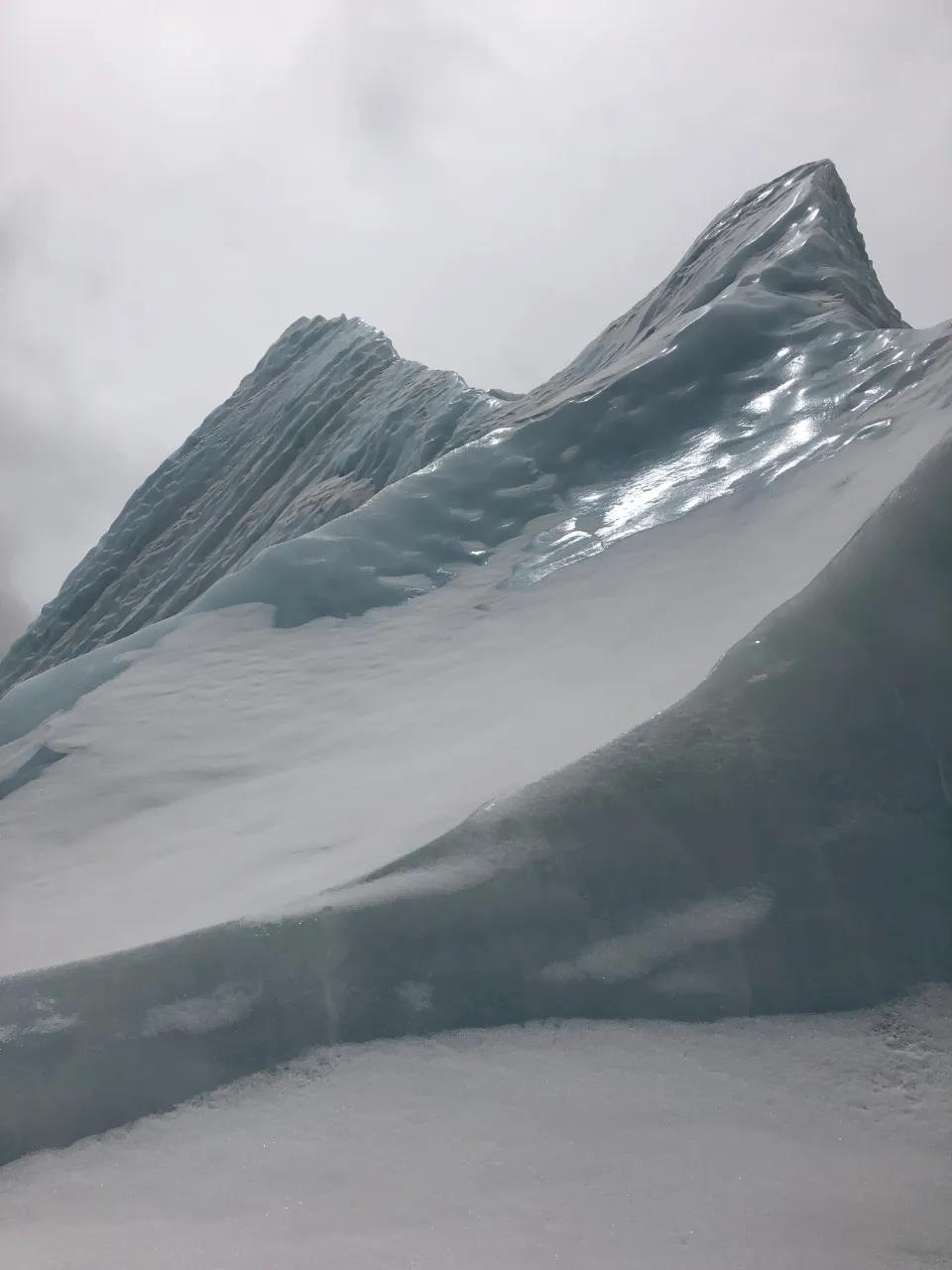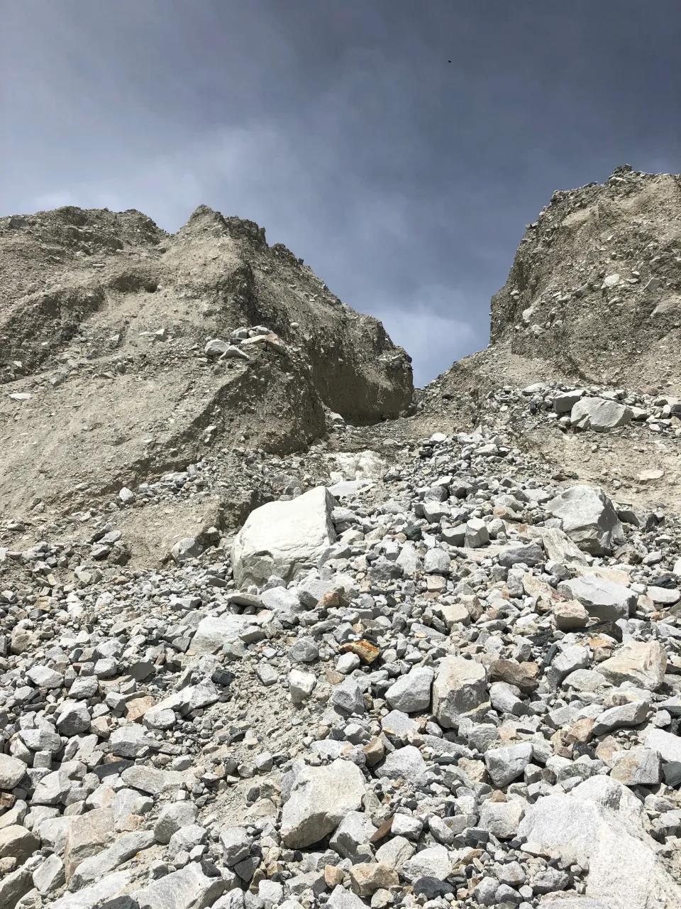 从那陡峭的山坡下来,我回望时突然意识到,我们攀爬的其实是一个巨大的滑坡体。这两天,我们其实一直行走在滑坡和坍塌上,哪有什么路啊。这些滑坡和坍塌在城市、在有人居住的地方都属于地质灾害,要么避让,要么治理。但这里是大自然,这一切都是大自然的正常现象,看着那些精妙绝伦的冰塔,谁会想干涉大自然呢?一望无际的石头,就我眼前这一片各种颜色、各种形状的石头,它们“身世”不同,可大自然通过自己的方式让它们聚在一起,某一天又会以自己的方式让它们分离。