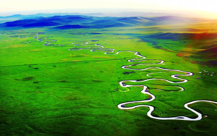 弯弯曲曲的莫尔格勒河像新抛光的银链般闪亮,也成为陈巴尔虎草原上最美的地方。这是一条发育在冲积平原上的蜿蜒型河流,河曲发达。物极必反,河流“弯”到极限就会“裁弯取直”,图中断续的积水河道和有植被覆盖的“隐形”河道,是“裁弯”时留下的痕迹。飞舞起来的飘带似的河湾与“废弃”河道,共同诉说着河流的发育史。因为河水的滋养,莫尔格勒河流域的草原碧绿青翠,和覆着青草的平缓丘陵一起,构成一幅淡雅的画面。