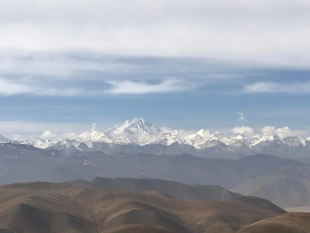 珠穆朗玛峰位于中间,她的左边是8463米的马卡鲁峰和8516米的洛子峰,她的右边是7543米的章子峰和8201米的卓奥友峰。她们的线条那么清晰秀丽,身姿那么娉婷动人,根本不需要化妆,不需要美颜。我想看到她们的每一个人,思想都会在刹那间脱离世俗,进入一个纯粹的领域,在那里陶醉,在那里涤荡。很多人称之为中国最美观景台,美这个字此时显得轻了点,我愿意称之为中国最神圣的观景台。