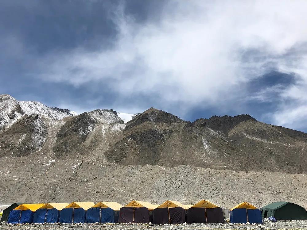营地的帐篷在大山面前很不起眼,但我远远地望见,依然十分兴奋。来到测绘队员的营地,也是我们将要入驻的营地时,飘起了雪花,珠峰的峰顶也被云层笼罩。十几顶帐篷已经被搭建起来,有宿舍、厨房、食堂。帐篷里都铺着地毯,让人感觉不到脚下是乱石滩。每个宿舍帐篷里都摆着几张行军床,还有一张桌子。建营的收尾工作正在进行。中午我们就在营地的食堂用餐,三菜一汤,提供餐盘和碗筷,条件超出我想象。大家围坐在一个长条桌四周,都吃得很香。