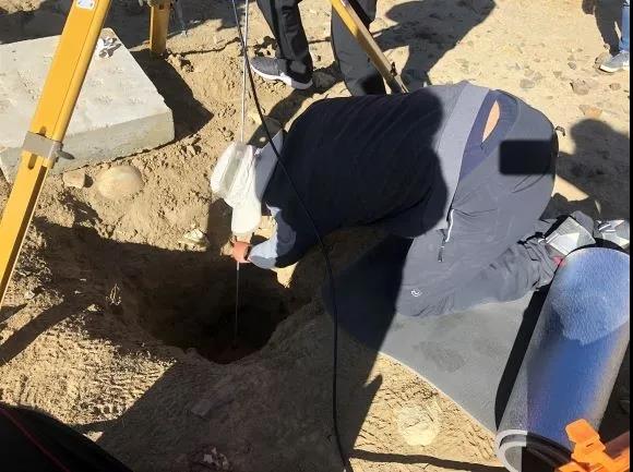 这个点位是2013年埋设的,为了保证点位的稳定,埋设的时候要在地上挖个坑,将梯形的金属标志与基岩固定在一起,上面盖上刻有点位信息的水泥盖子。找到点位后,史志刚先用工兵铲把坑里覆盖的泥土挖出来,露出金属的尖顶,这个尖顶就是这个点的位置。测量这个点的GNSS数据,就必须让仪器的中心正对着这个尖顶。三脚架调了半天,终于固定好了。这时还要测量尖顶到仪器的高度,可仪器配备的测高杆不够长,只好用钢尺量。史志刚趴在地上,把钢尺的一端伸进坑里,任伟拿着另一端在仪器的位置读数,量了三次,取个平均数。