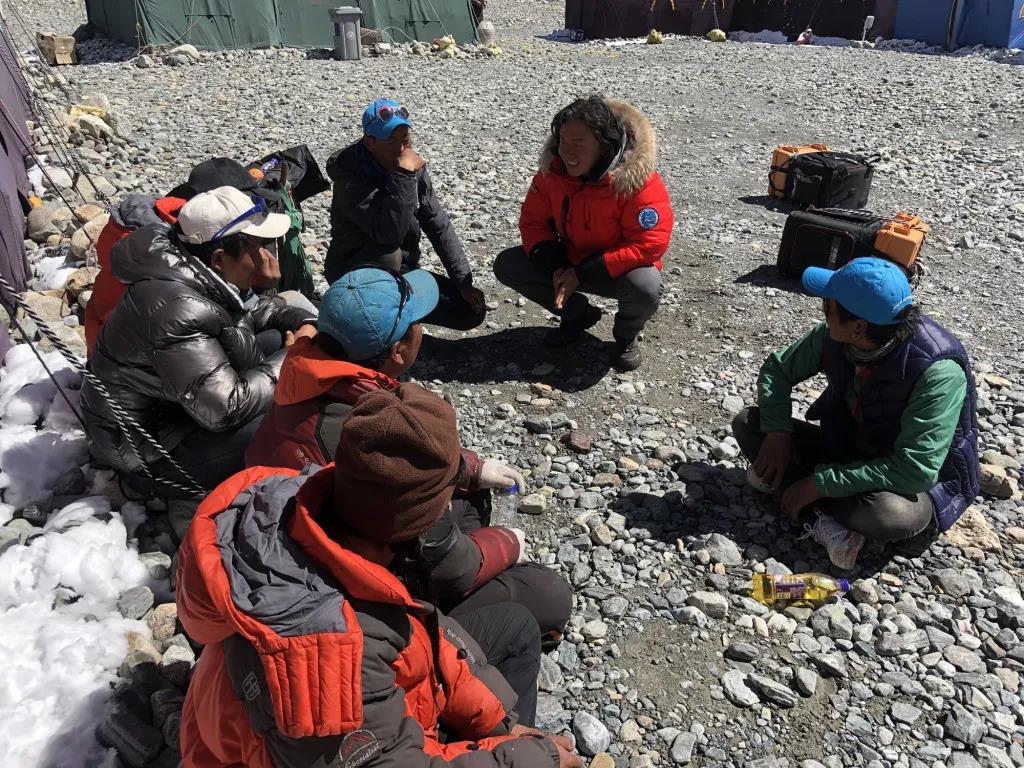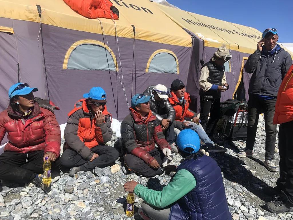 上午,营地里来了8位藏族同胞,他们是珠穆朗玛峰上的背夫。其中一位看上去年纪稍大,其余7位都是二三十岁的小伙子。珠峰大本营再往上,车辆无法通行,所有物资运输都要靠牦牛驮,靠人背。珠穆朗玛峰上的背夫默默无闻,但每次攀登背后都少不了他们的汗水。
