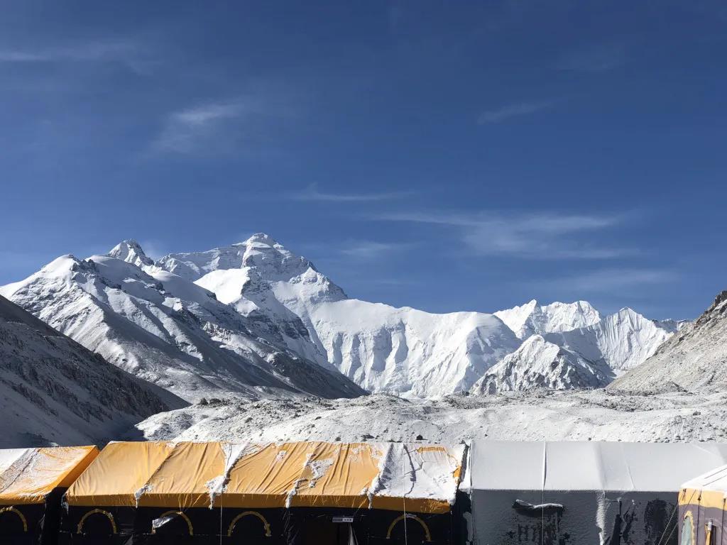早晨起来,昨夜的云朵不知是飘荡到山的那边,还是躲藏到了天空的蓝里面。珠穆朗玛峰耸立天际,在眼前闪着耀眼的白,大家都不由自主地把相机对准她的方向。真是难得的好天气!