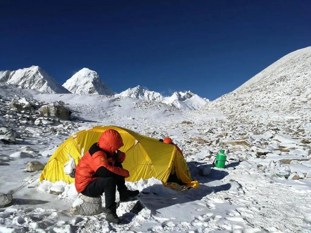 中午,阳光明媚,风也温柔。自我第一次来大本营起,这里就一直刮南风,今天却异常地刮起了北风,难道这是窗口期将要到来的预兆?但下午的直播刚结束,就下起了雪,气温骤降。现在敲字,手指头都冻得发麻。可我总是会想起交会点上蜷缩在小帐篷里的兄弟们,他们在寒风中是如何度过的呢?
