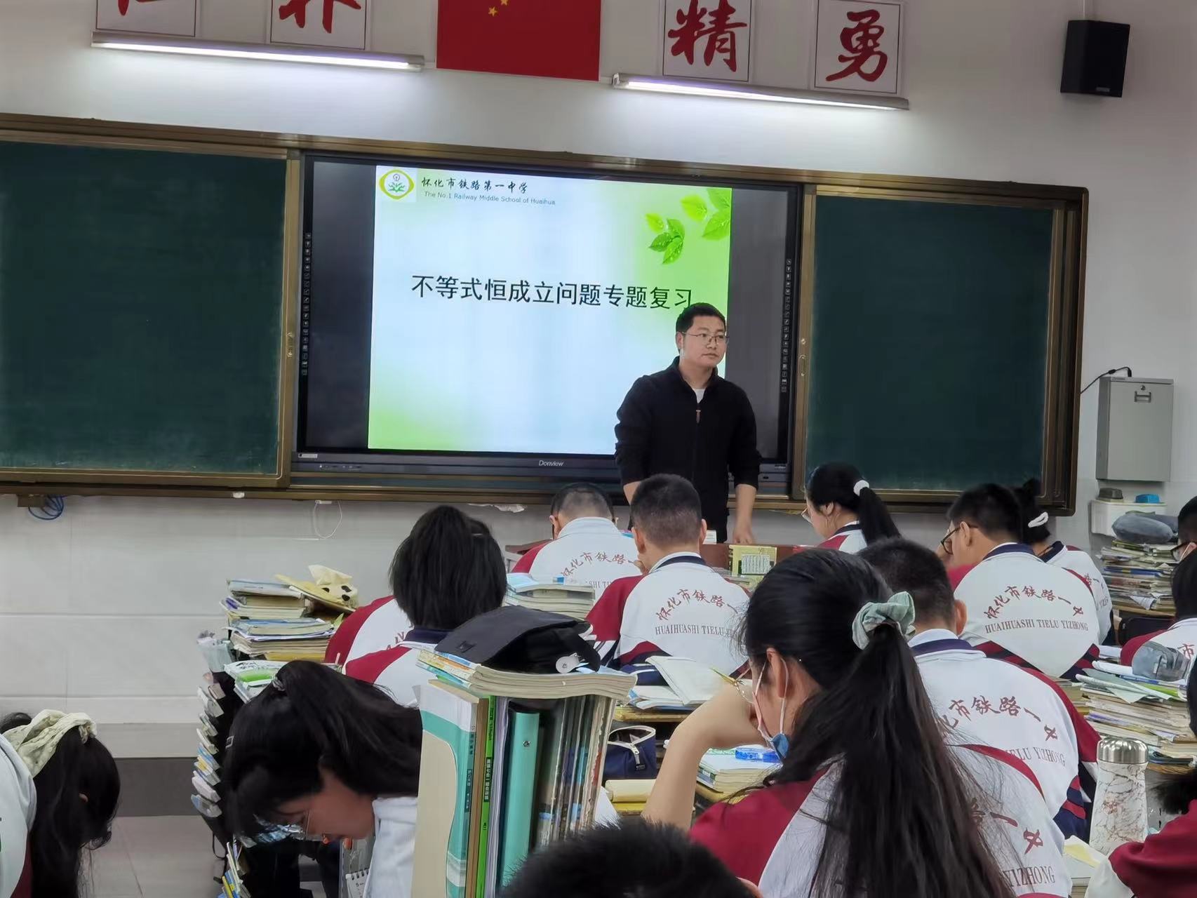 高用老师去年被评为怀化市首批骨干教师,为进一步发挥骨干教师的引领作用,在学校教研室的安排下,高用老师在335班上了一节《不等式恒成立问题的专题复习》示范课,引来了不同学科的老师前来听课。课堂中教师注重与学生的思维交流,充分发挥学生的主体作用,教师作为课堂的组织者,在易错和思维困难处予以点拨,启发学生探究由高用老师最新研究发现的“临界值法”,并利用该解法求解不等式恒成立问题,将课堂推向高潮。