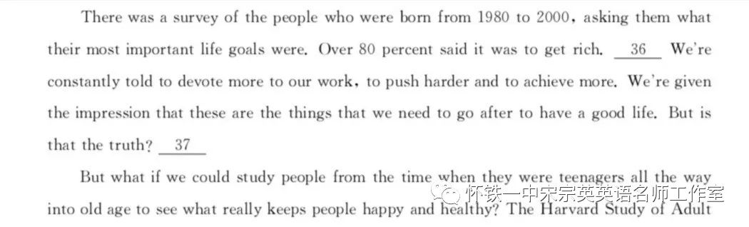 37:第一段说到我们一生中所追求的是钱财和名誉。第二段but表示转折,要是我们从人们青少年时开始研究,什么能使他们幸福健康,由此可见得出的答案可能不同,可得出来第一段结论正是G选项。答案G表示有时财富和名誉能使我们幸福。