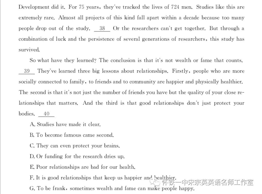 39:研究结论表明,财富和名誉并不重要,通过39题之后的段落可知,这里健康与幸福与人际关系有关,因此选F。