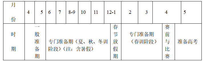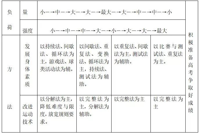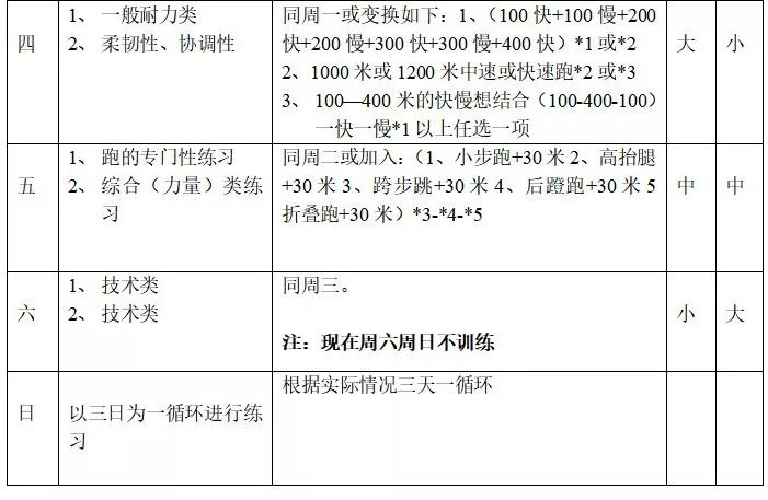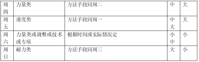 循环原则:可以从周一开始也可以从周二开始,总体上按隔日进行力量训练,并根据学生的实际情况调整力量训练的次数,如强调耐力训练时可以加强耐力训练的次数和调整时间。调整课时以技术和灵敏训练为主,佐以球类活动。