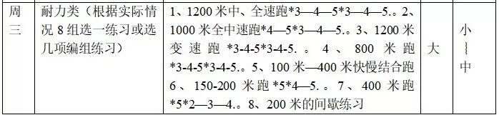 1、慢跑:量--2000米,五圈。前三圈用百分40-50的能力跑,第四圈用百分50-60的能乱跑,第五圈前300米用百分70-80的能力跑,最后80-90米用百分90的能力跑。