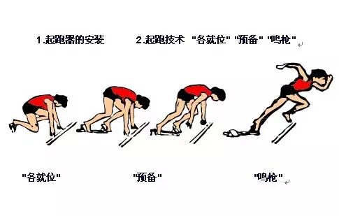 听到枪声,两手迅速推离地,两臂屈肘有力地作前后摆动,两腿迅速蹬地,使身体向前上方运动,前腿快速有力地蹬伸髋,膝,踝三个关节.