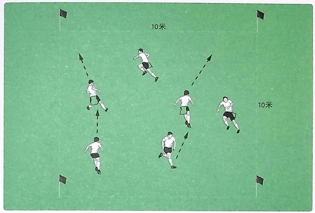 所有队员站在训练区域内,每两名队员为一组,每组一名队员持球。无球队员在训练区域内无球跑动,有球队员在喊出无球队员的名字后向其传低平球或者抛高空球,无球队员必须用身体某一部位直接将球传给传球者。