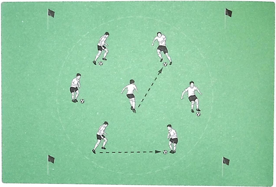 教练站在训练区域中间,队员按照教练要求(内侧,外侧,左侧,右侧等)带球。听到指令后所有队员在互不干扰的情况下加速沿虚线带球。