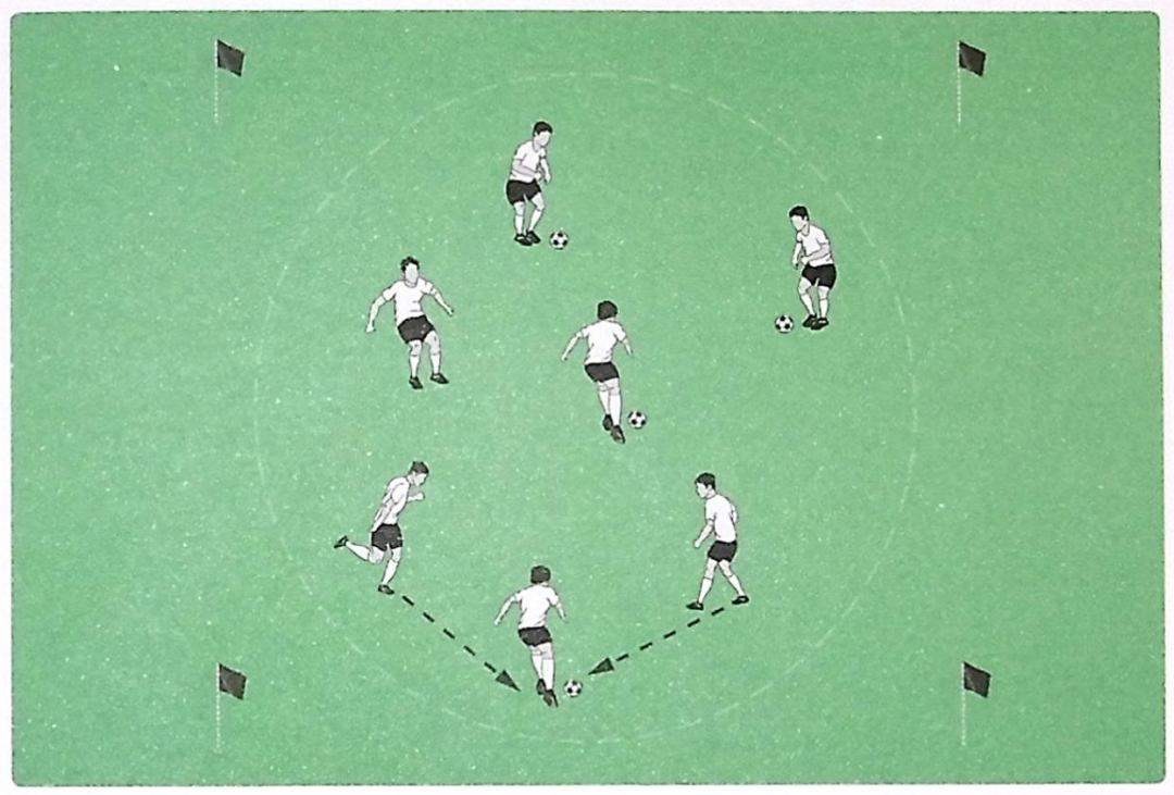 多名队员一人一球在训练区域内(如中圈)带球,一名或多名无球队员(猎人)有球队员脚下的足球踢出训练区域,直到最后仅剩一名队员持球,他就是游戏的胜利者。有球队员一旦丢球,就应当立即离开训练区域。