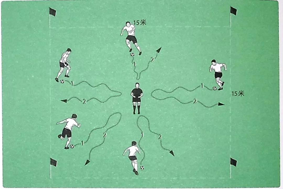 训练区域的中间站一名或多名防守队员,其他队员听到指令后带球通过。