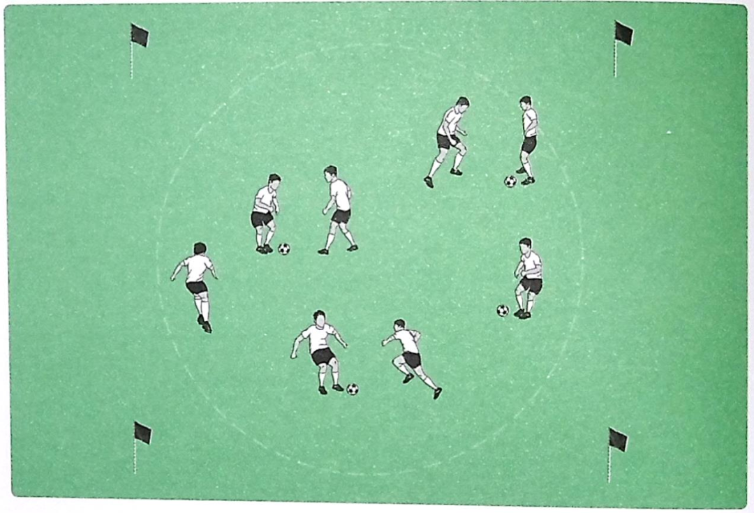 与前一练习相似,但有球队员丢球后并不离开训练区域,而立刻转变为“猎人”,直至所有足球都被踢出训练区域。