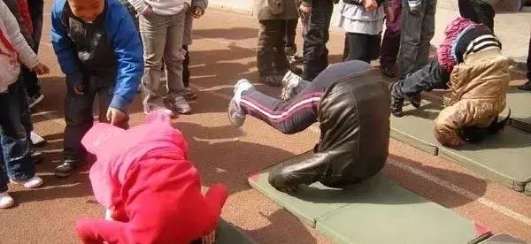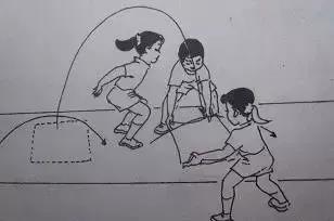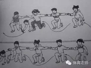 游戏方法:把学生分成三人一队的若干小组,甲乙两人面向而立,双手各拿着展开报纸,低放在丙前面。裁判发令后,丙向前跳过报纸蹲下,然后甲乙两人再拿着报纸举过丙的头顶,放在他的前面让他再向前跳,丙先跳到终点的队为胜。