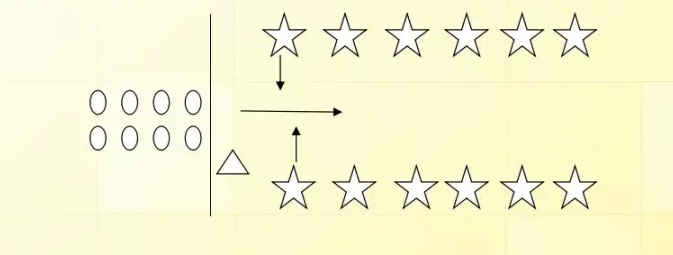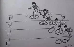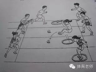游戏方法:场地队形如图。裁判发令后,排头跨进前圈,然后手拿后圈前移,再跨进前圈移后圈——依次轮流移动双圈向前,直达对方“岸”边,跳上“岸”。对方排头照此进行,顺利往返到最后,先完成渡“河”任务的队为胜。