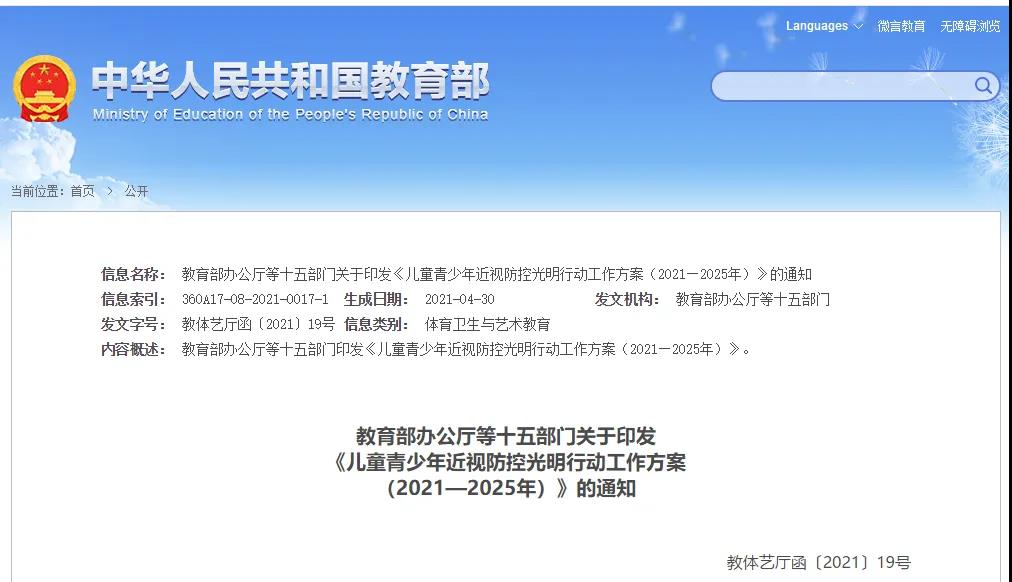 就在今年5月,教育部制定了2021年全国综合防控儿童青少年近视重点工作。重点工作明确15个联席会议机制成员单位2021年在发挥统筹协调作用合力推进近视防控,推动和督促学校、医疗卫生机构、家庭、社会强化儿童青少年近视防控等方面完成重点任务67项。其中包括,小学一二年级每学期校内统一考试不得超过1次;全面实施寒暑假学生体育家庭作业制度,确保儿童青少年视力健康电子档案一人一档,并随学籍变化实时转移,等等。