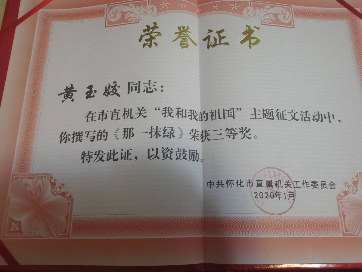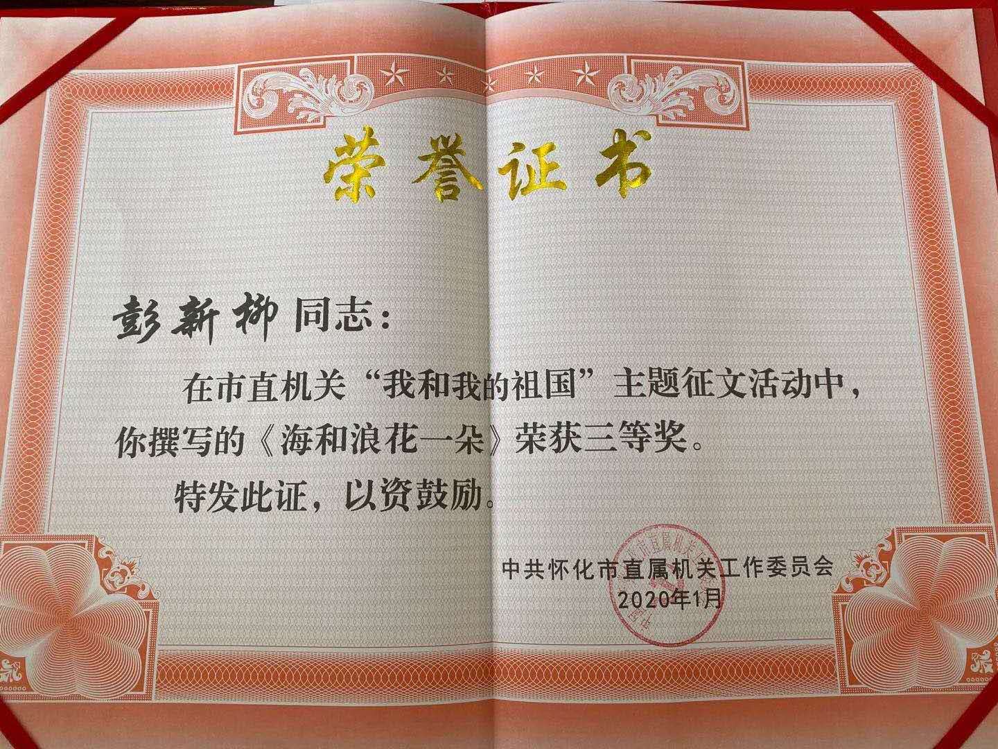我校彭新柳和黄玉姣两位老师在怀化市市直机关“我和我的祖国”主题征文活动中获得三等奖