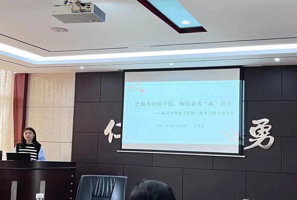 会议开始,首先由赴长沙参加讲座的兰茂香老师进行经验分享。兰老师从“明考情,探规律”与“知学情,析问题”两个方面概括此次学习的经验,结合近年高考真题深入浅出地解析了“素养指向”、“情景化命题”、“反套路”等关键词,并针对“如何做好学情分析”阐述了自己的深刻理解。