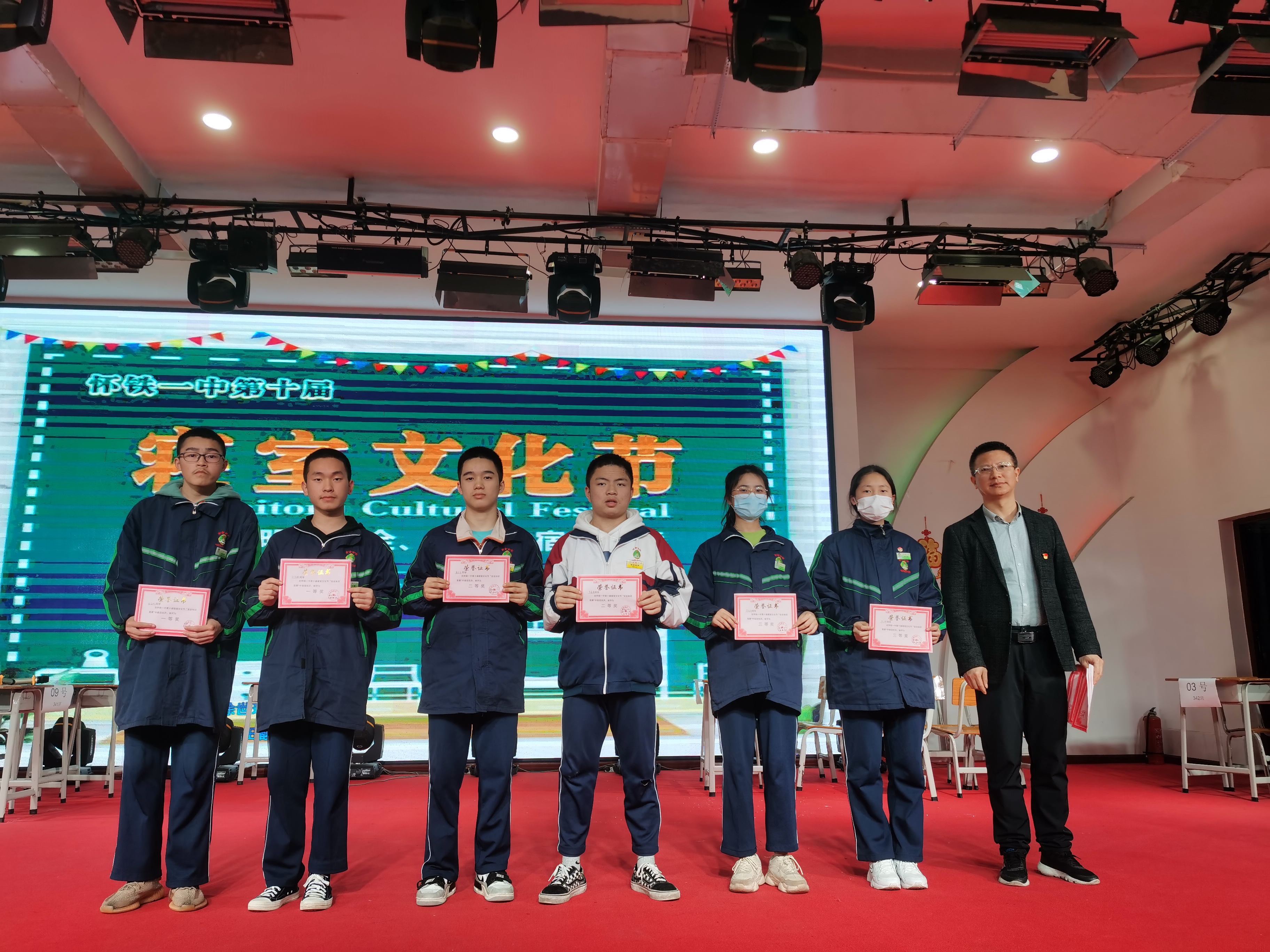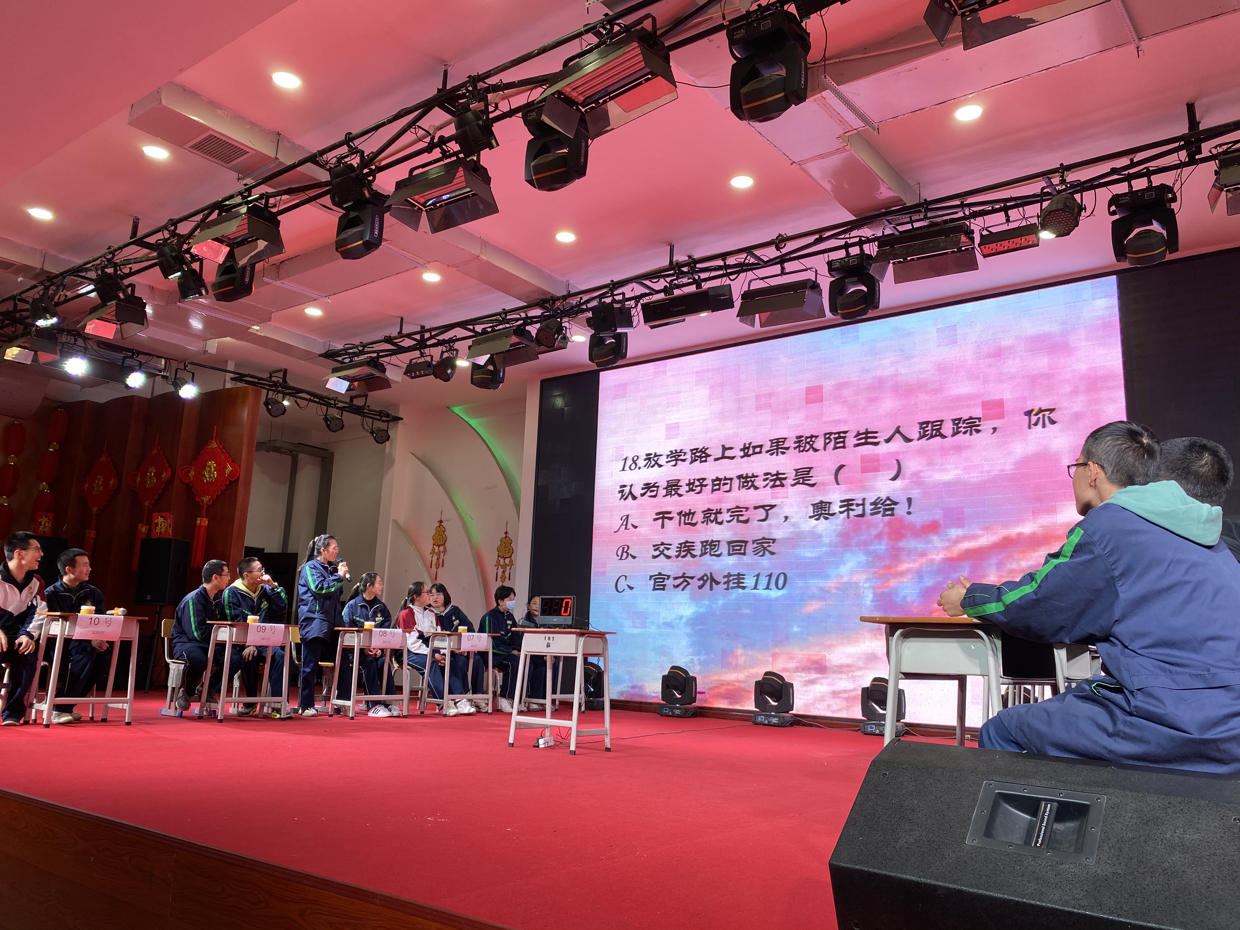 大礼堂内灯光明亮,人声鼎沸驱散了黑暗,带来了温馨。在2021年4月25日6 点40分,知识竞赛在大礼堂内准时举行。到场的嘉宾有刘华书记,刘蓉老师,姚玙烟老师,曾琳娜老师,唐木兰老师。