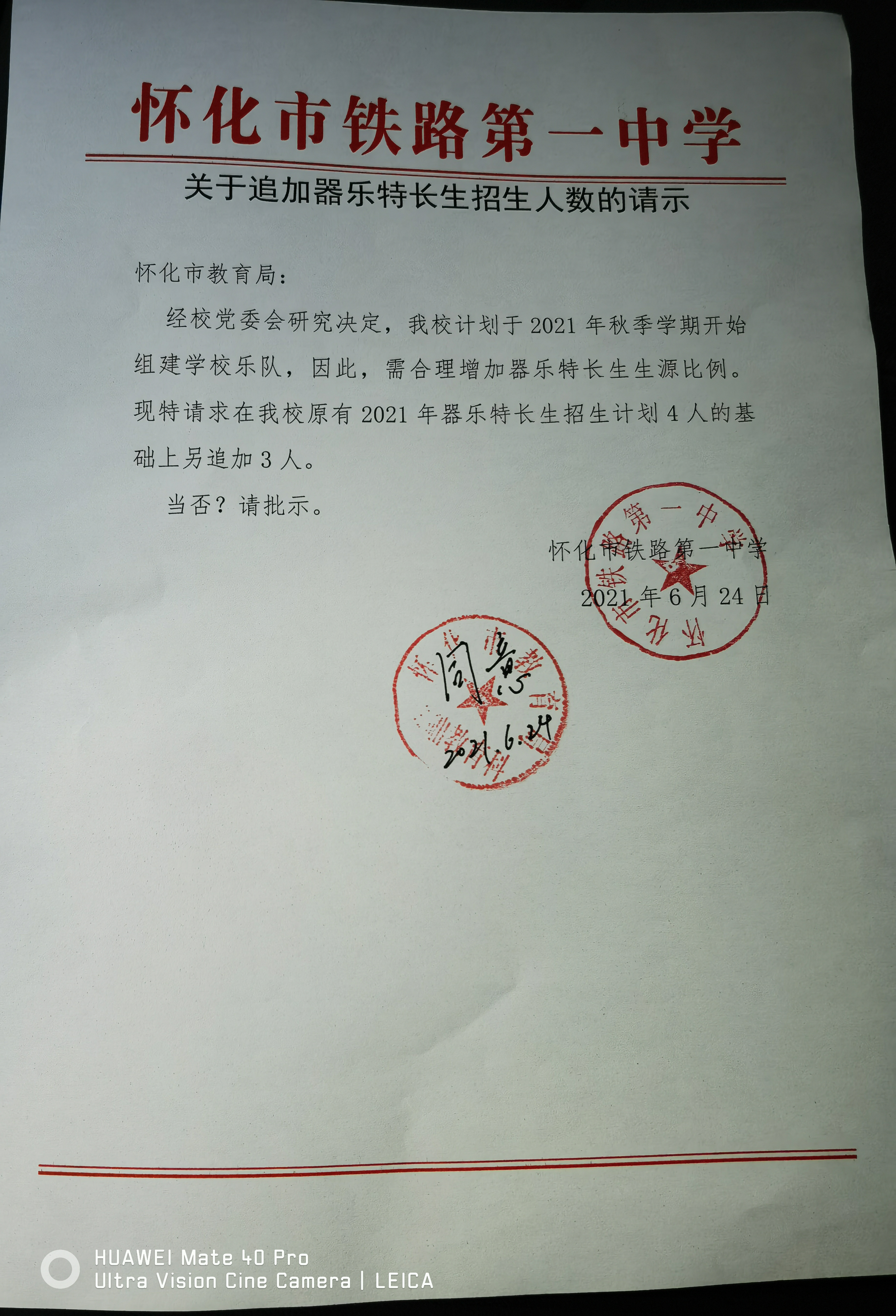 关于追加器乐特长生招生人数的请示