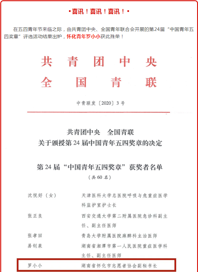 转发祝贺!怀化青年罗小小荣获“中国青年五四奖章”!