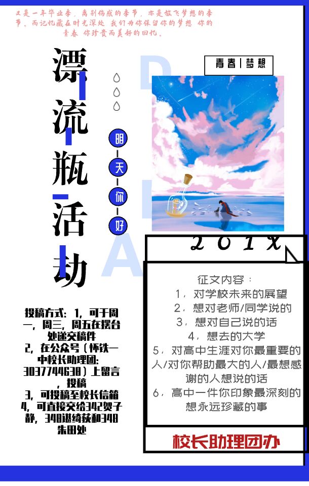 又是一年毕业季,你是否有些话要对老师,对同学们说的呢?对未来的自己又有什么样的期望呢?对你学习,生活了三年的铁一一定非常不舍,有许多话想说吧!来参加万博二维码扫描登录 校长助理团举行的漂流瓶活动吧!你们的美好回忆,我们们为你们珍藏!